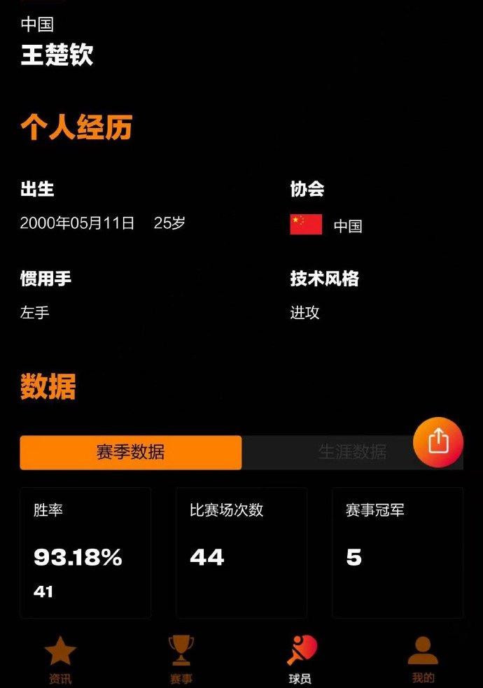 赛事成绩明细:6冠:亚洲杯(深圳)、WTT重庆冠军赛、美国大满贯、澳门冠军赛、中国大满贯(北京)、多哈世乒赛。1亚:横滨冠军赛(决赛负张本智和)。1季:澳门世界杯(半决赛不敌雨果)。1四强:新加坡大满贯(半决赛负梁靖崑)。关键数据:全年国际赛单打胜率93.18%(44战41胜)